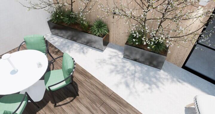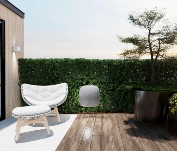 Ondanks de beperkte ruimte hebben we een vlonder van padoukhout aangelegd die zich over de volledige breedte uitstrekt, waardoor de tuin optisch breder lijkt. Op de wanden hebben we horizontale bamboe reliëfpanelen geplaatst, waardoor de muren ook hoger lijken.