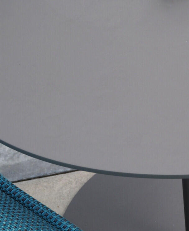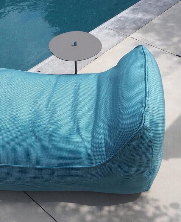 Een laag subtiel zonnebed met een verstelbare rugleuning. In het midden van dit vak wordt de zichtlijn onderbroken door een gezellige zitkuil die ruimte biedt aan de hele familie en hun gasten. Het geheel is uitgevoerd in frisse blauwtinten, afgewisseld met subtiele parelmoertinten.