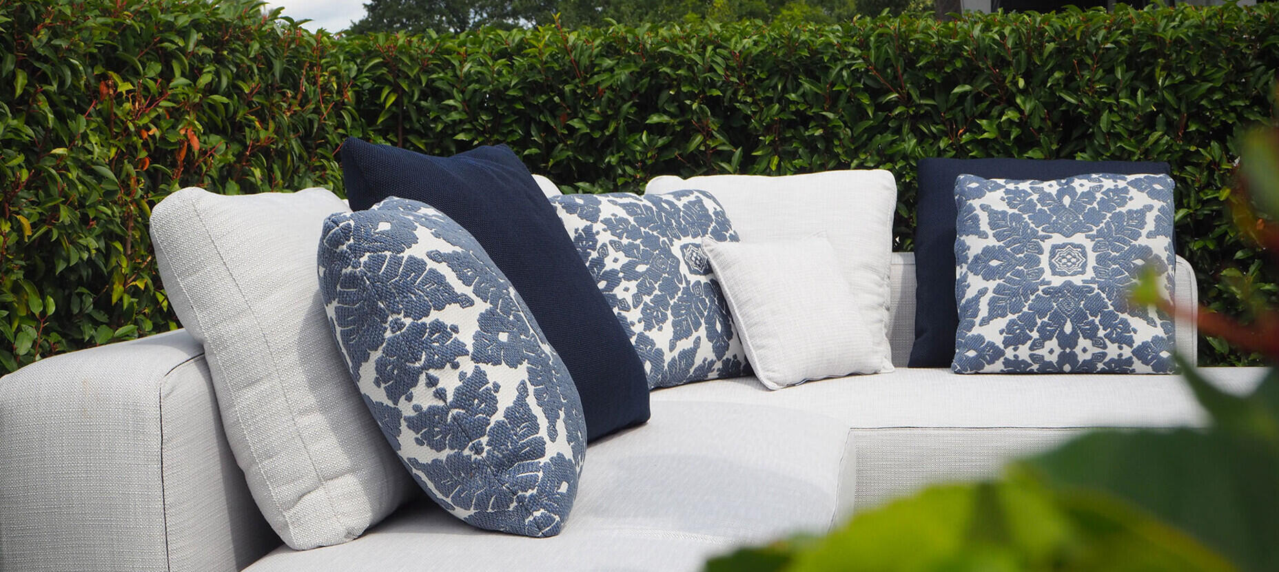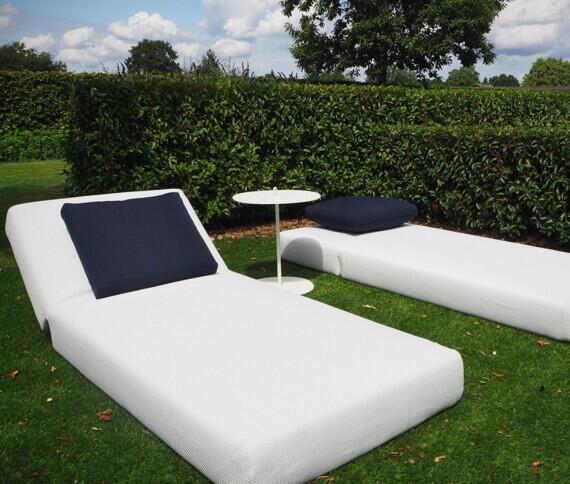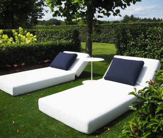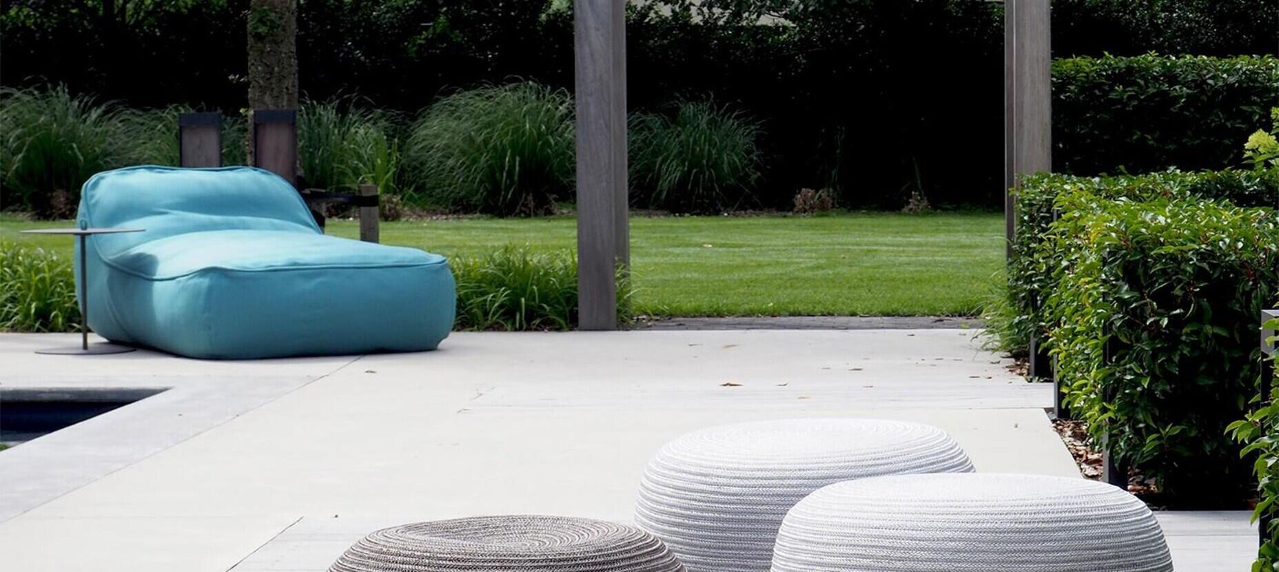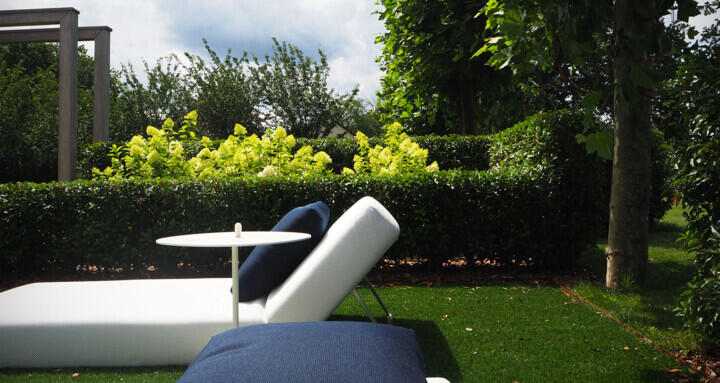 Een uitstekend voorbeeld hiervan is de Dandy bank van Roda. Met zijn rechte eilandelementen kan deze bank strategisch geplaatst worden om perfecte zichtlijnen te creëren en zo een gevoel van rust te bevorderen. Aan de andere zijde van de haag plaatste we twee zonnebedden. De Swell van Paola Lenti.