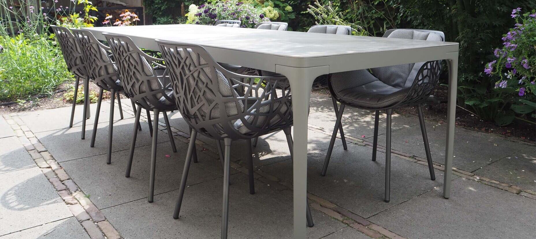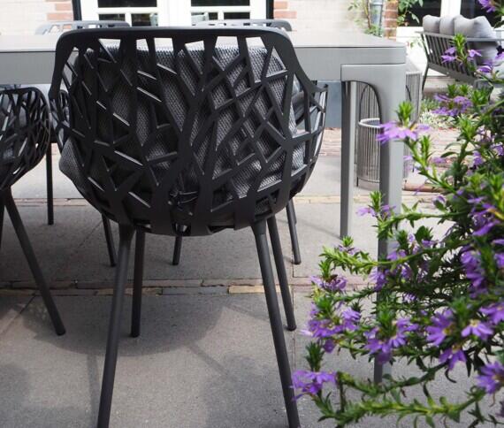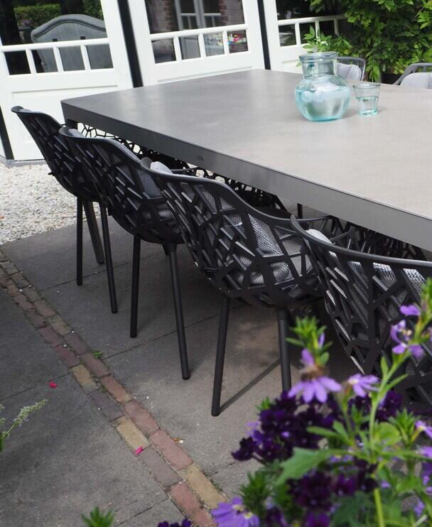 Dit stijlvolle en monumentale pand met een prachtige tuin staat in Doorn. Het pand dateert uit 1905 en heeft allerlei originele kenmerken die het monumentale gevoel versterken. Ook buiten is dit het geval. Een rijke groene begroeiing, geeft het geheel klasse. Voor dit project is ons gevraagd mee te denken over een diningset. De wens was een opvallende set, tijdloos, moet passen in de omgeving en niet teveel toeters en bellen; Strak! Het resultaat is de Playtafel van Ethimo en Forest stoelen van Fast. Beide Italiaans. De subtiele belijning van de tafel contrasteert met de architectuur, waardoor de tafel meer aanzien krijgt. Het blad is van keramiek en daardoor zeer praktisch in onderhoud. De Forest stoelen passen met hun organische structuur perfect in de tuin.