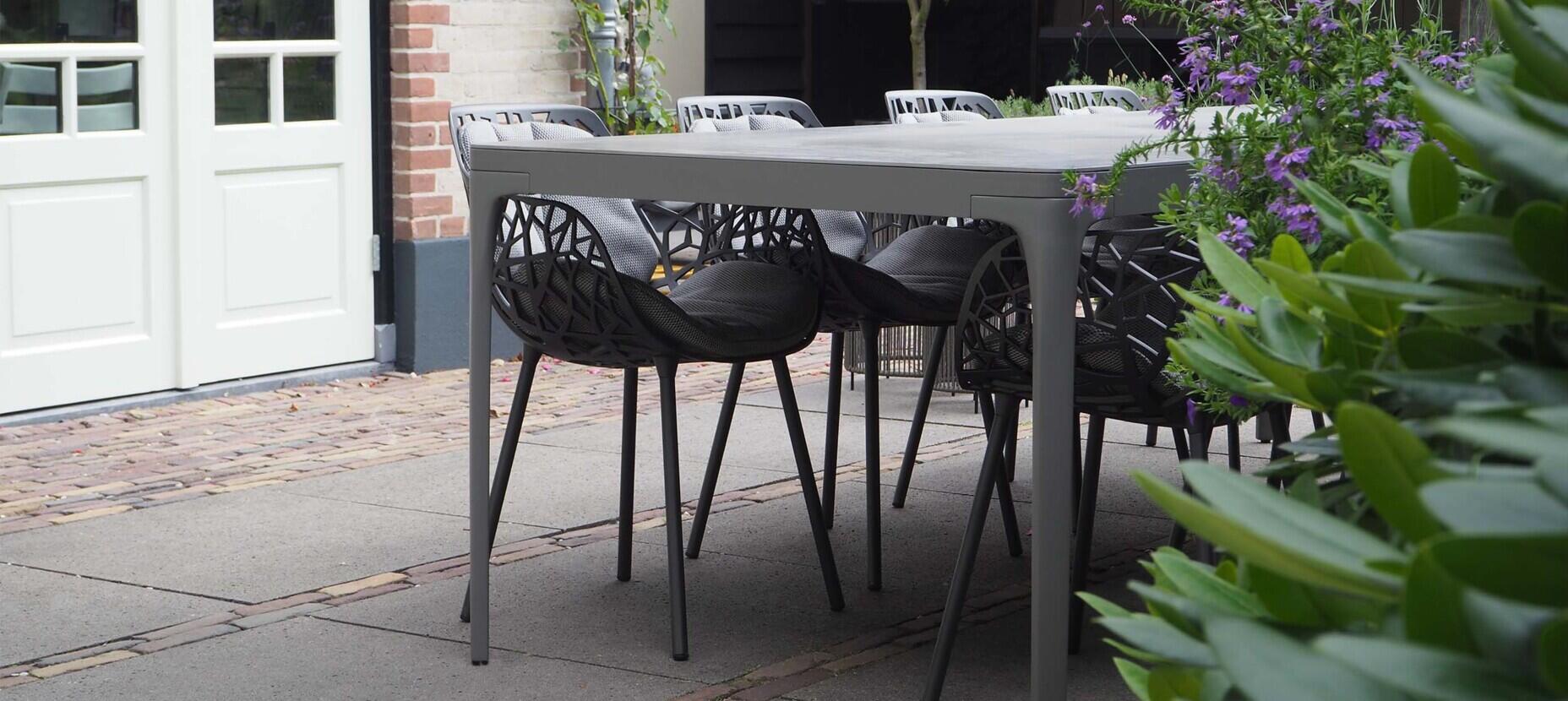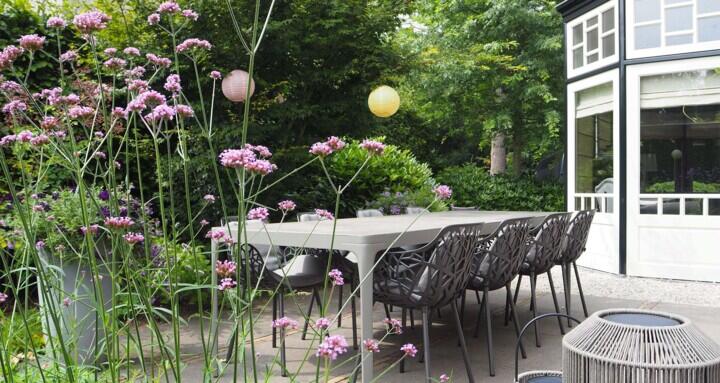 Ook de Mora lantaarns van Vincent Sheppard passen naadloos in deze tuinsetting. Voor het geheel is gekozen voor grijstinten, waardoor de diningset, hoewel vriendelijk toch ook een zakelijk karakter krijgt. Echt een eyecatcher!