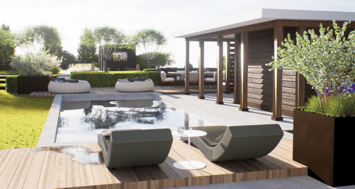 Maar daar blijft het niet bij. Deze tuin beschikt ook over een prachtig zwembad en hottub van Serena Spa, voor de ultieme ontspanning op zomerse dagen. En wat is er nu heerlijker dan na een frisse duik opwarmen onder de luxe buitendouche?