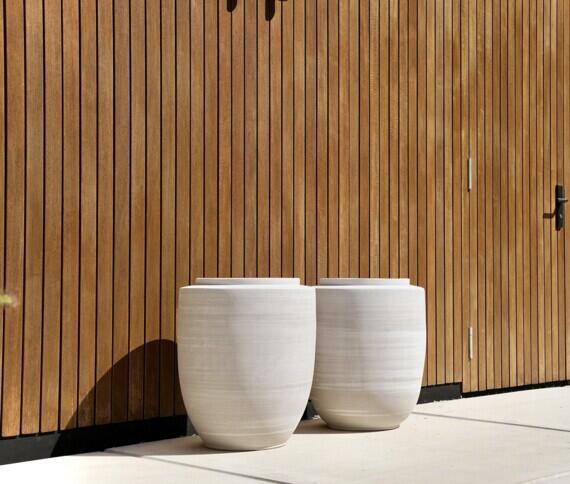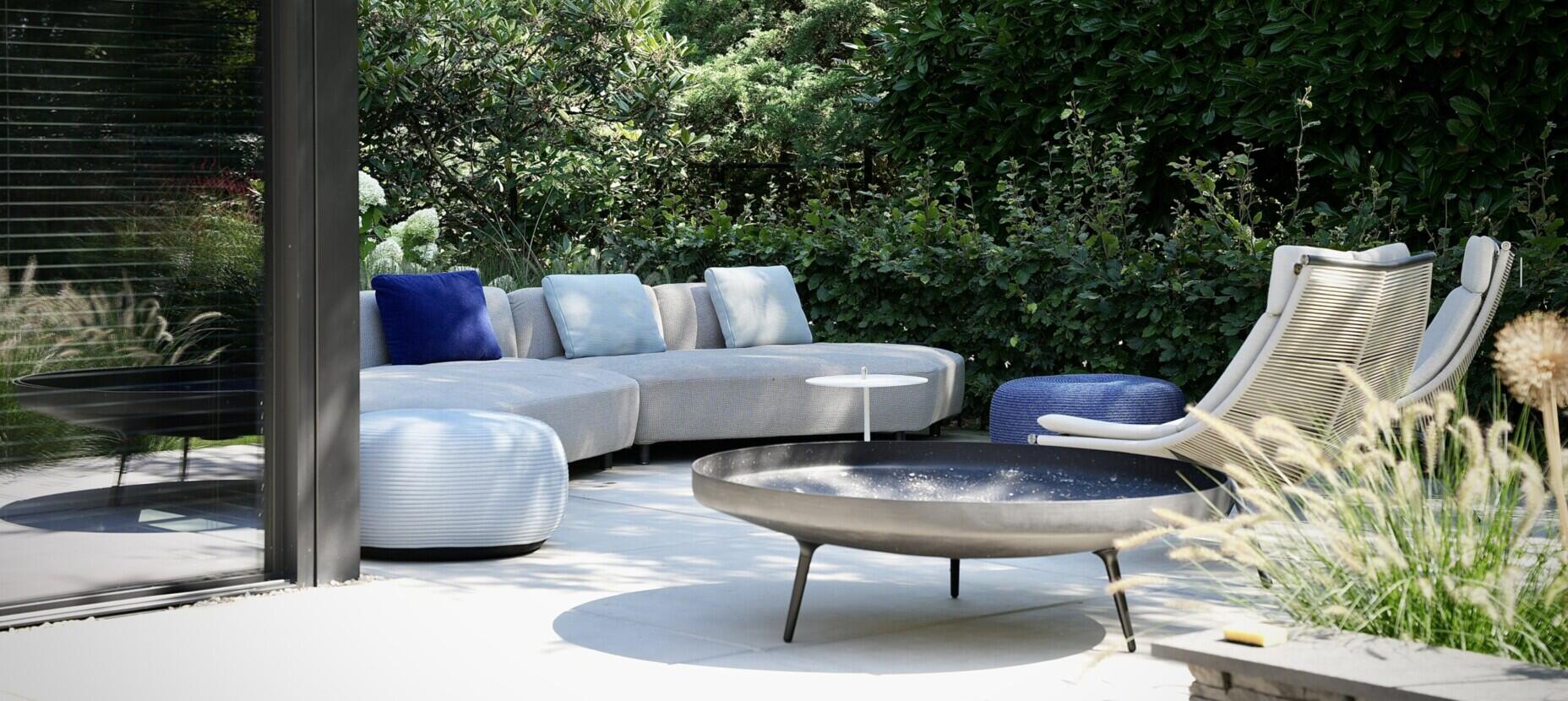 Het tweede loungegedeelte ademt Italiaanse elegantie, dankzij de Mamba bank en de Laze stoelen van het gerenommeerde merk Roda. Deze strakke, maar comfortabele meubels nodigen uit om te ontspannen en te genieten van het prachtige weer. Als extra toevoeging is de Firebowl van Gloster geplaatst, die zorgt voor een knus en warm gevoel tijdens de koelere avonduren. Ter decoratie zijn er stijlvolle potten van Vincent van Duysen geplaatst, die de ruimte een extra dimensie geven. Deze potten, met hun minimalistische vormen en natuurlijke uitstraling, complementeren de Italiaanse meubels op subtiele wijze.