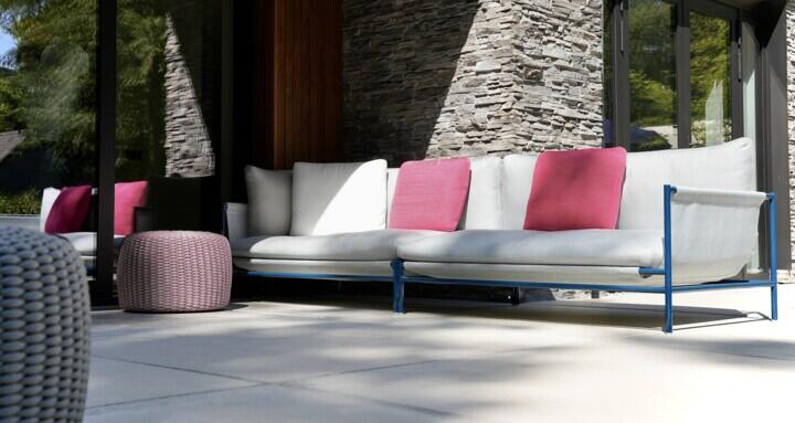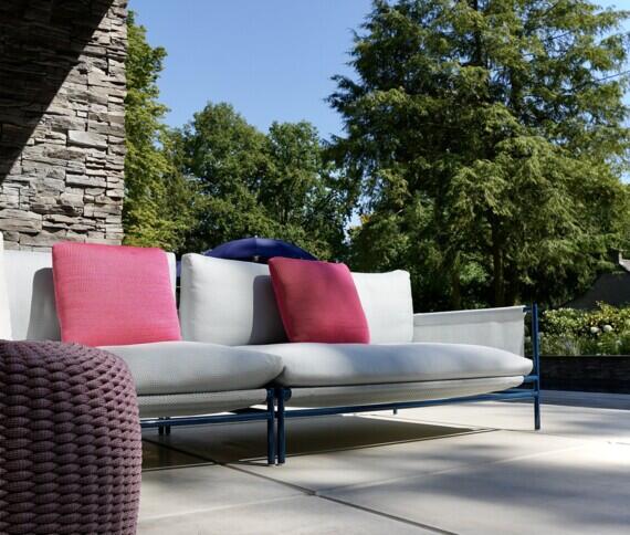 In de eerste loungehoek staat de fraaie Canvas bank van Paola Lenti centraal. Deze Italiaanse design grootheid staat bekend om haar kleurrijke meubels en uitgebreide stoffencollectie en dat is duidelijk terug te zien in dit project. De Canvas bank wordt vergezeld door de Strap sidetable, het Net10 kleed, de Leo bijzettafel en de Otto poufs, allemaal van hetzelfde merk.