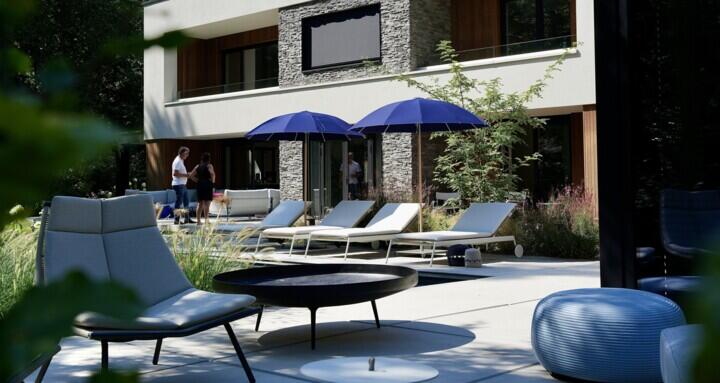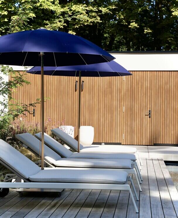 Bij het prachtige zwembad heeft Strak Studio gekozen voor een combinatie van comfort en stijl. Hier vindt u luxueuze ligbedden van Roda, die uitnodigen om te zonnebaden en te genieten van het heerlijke weer. De ligbedden worden vergezeld door twee Weishäupl parasols, die beschutting bieden tegen de felle zon en een elegante toets toevoegen aan het geheel. Met hun strakke lijnen en neutrale kleuren passen de parasols perfect bij de moderne uitstraling van de tuin.