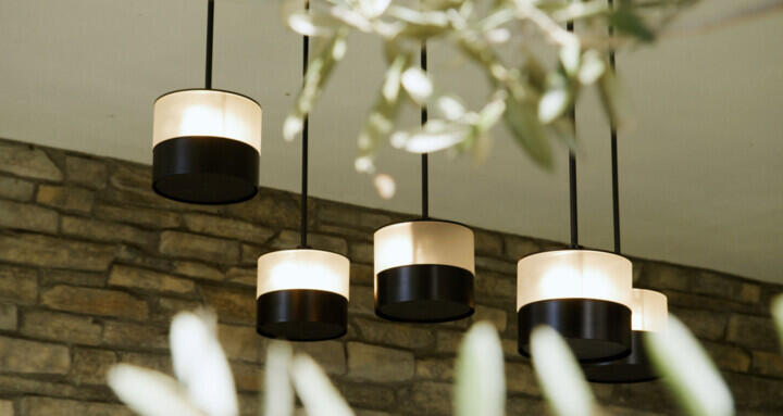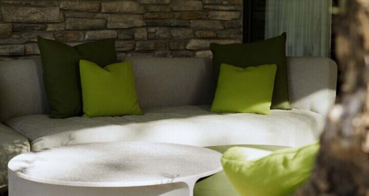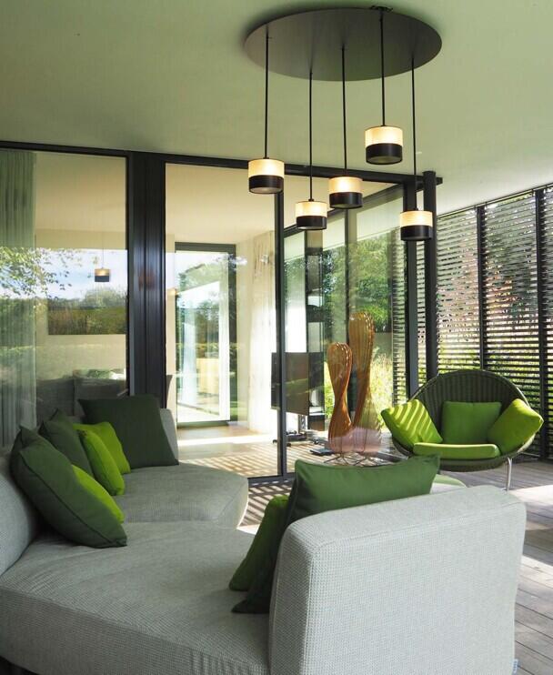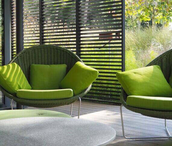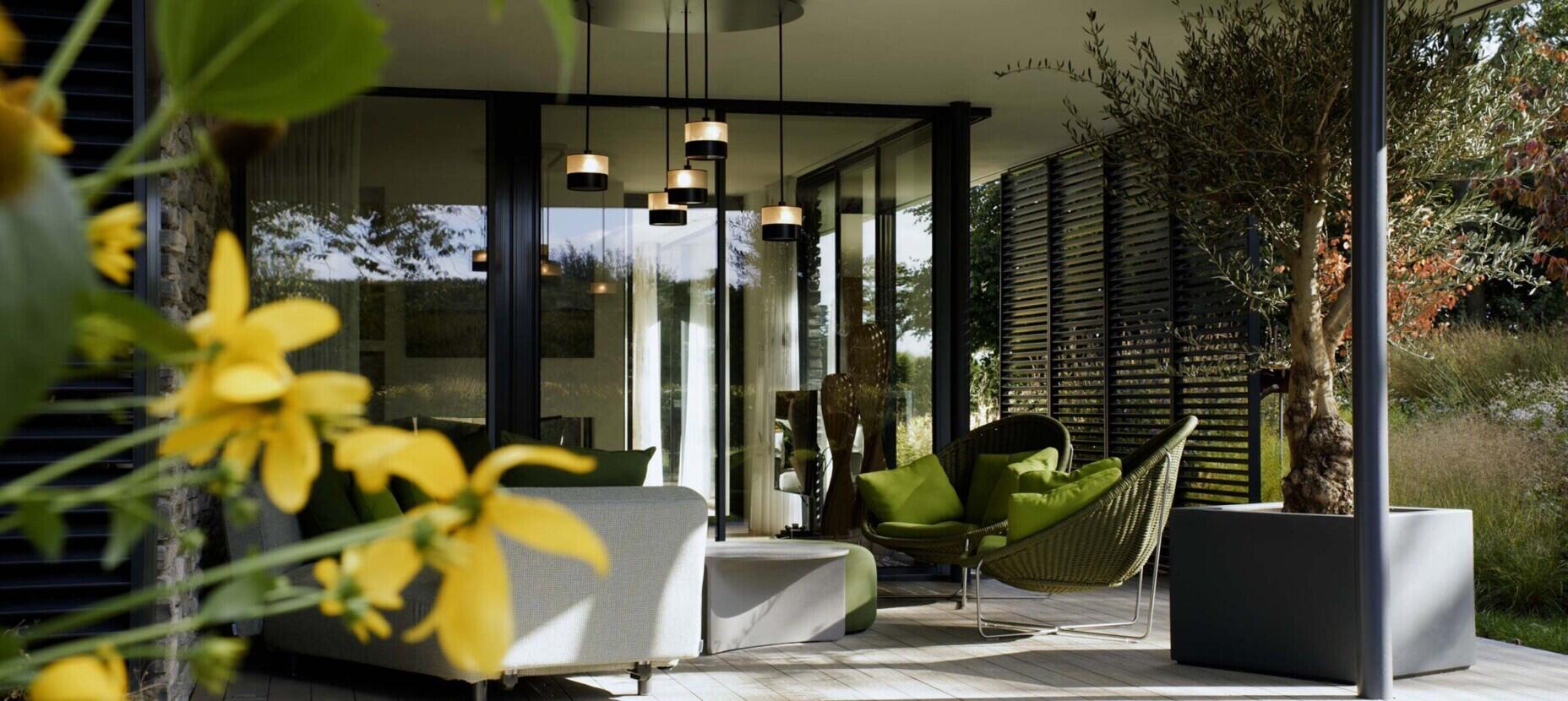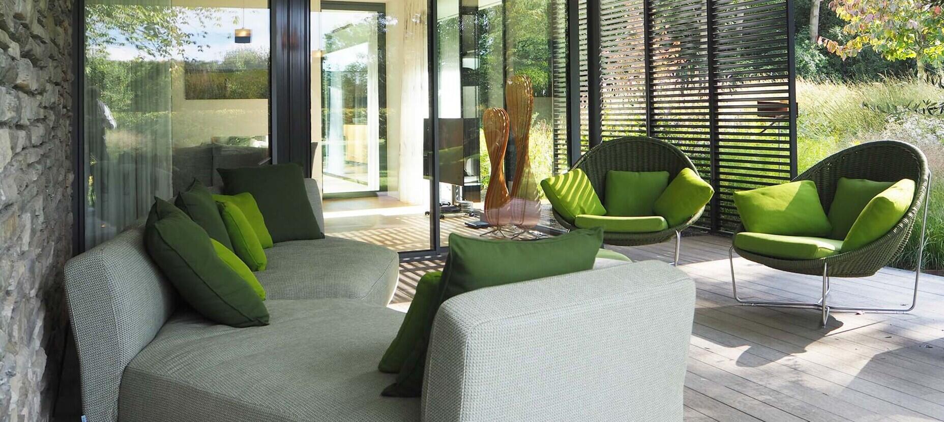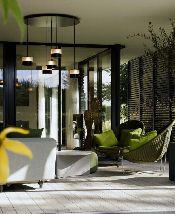 Om tot dit prachtige decor te komen, koos Strak Studio voor exclusieve design meubels in frisse natuurlijke kleuren gecombineerd met stijlvolle accessoires passend bij de locatie. Zo zorgen exclusieve meubels van diverse topmerken voor een heerlijk sfeerbeeld onder de overkapping aan de voorzijde van de villa. We zien de Mamba bank van Roda in een fraaie, creatieve hoekopstelling, de Nido fauteuils van Paola Lenti en de Glow lampen (met ingebouwde heater onder elk van de 5 lampen) van het merk Heatsail.